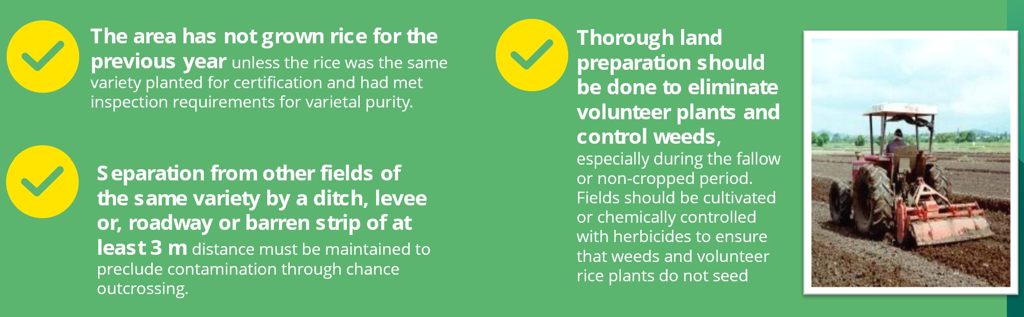 In most countries, the fields used for growing certified seed must meet of the following criteria: