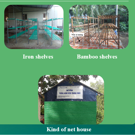 • Growing shelves, comprised of bamboo or iron, have 3-4 floors spaced 0.5m apart to allow for convenient movement.