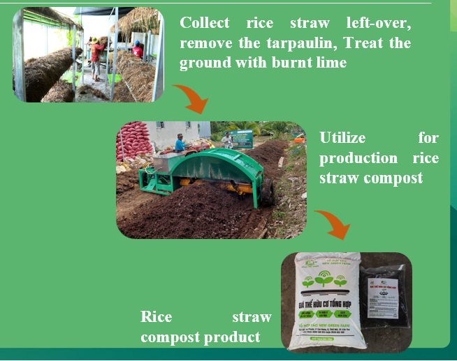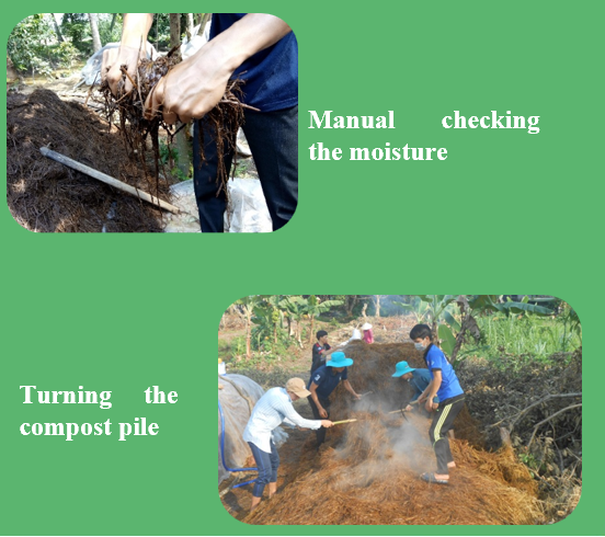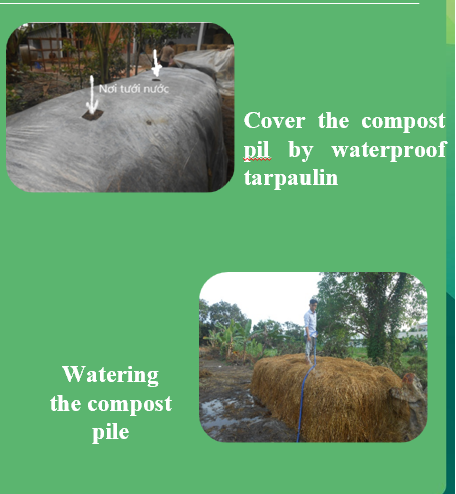 • Continue stacking layers until the compost pile reaches the desired size (the amount of raw straw to be used is at least 1 ton to ensure that the size of the compost bed is about 1.2 – 1.5 m high, about ≥1.5m wide and 1.5 m long or can be increased depending on the amount of straw). Remove plants from the middle of the pile to create more space. Ensure ventilation of the compost pile and cover it with a waterproof tarp to maintain moisture and heat.