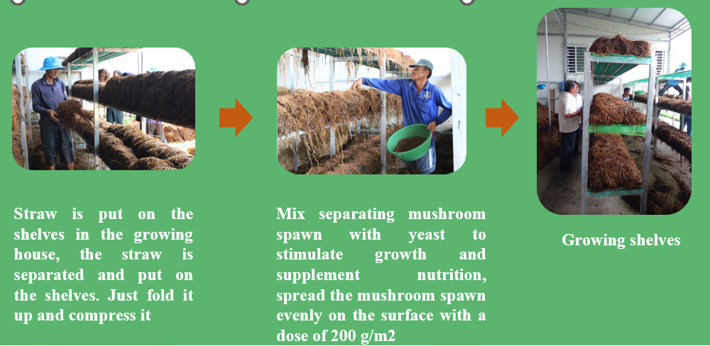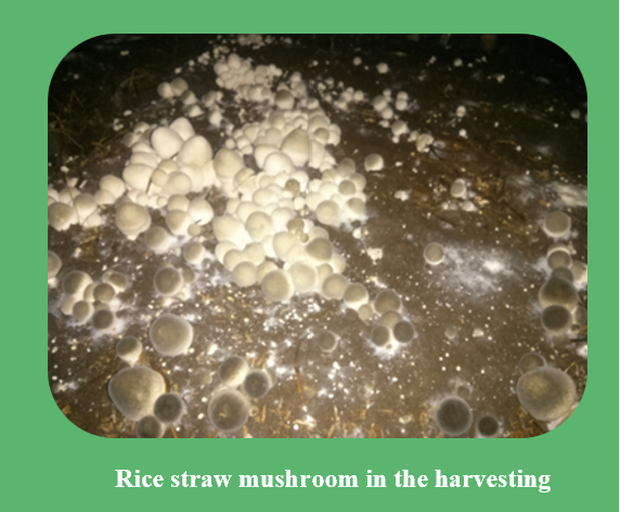 • Harvest straw mushrooms at the egg-shaped stage. Harvesting should be done twice a day, in the morning (5 – 6 am) and in the afternoon (5 pm – 6 pm), to ensure quality, productivity, and a high selling price.
