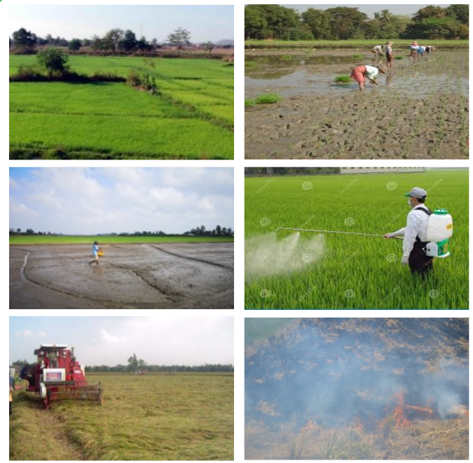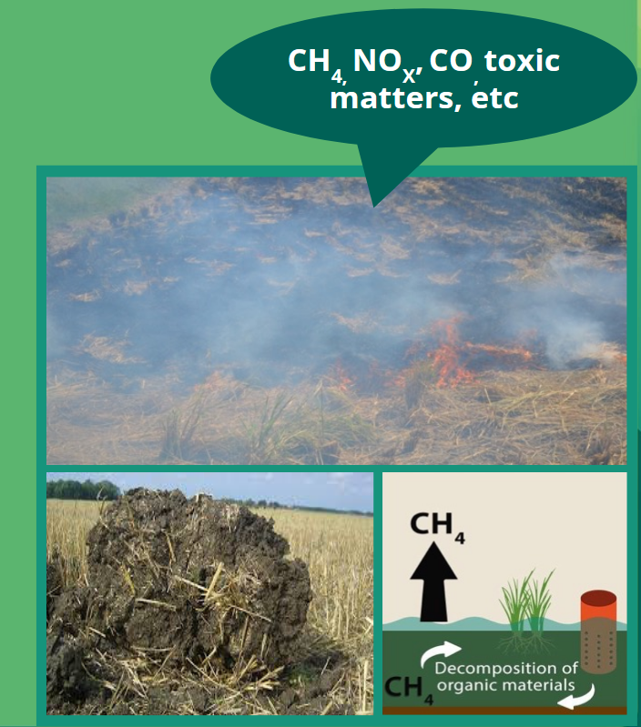 - Rice straw burning and incorporation in flooded field causing nutrient lost, biodiversity loss, GHG emissions and pollutions