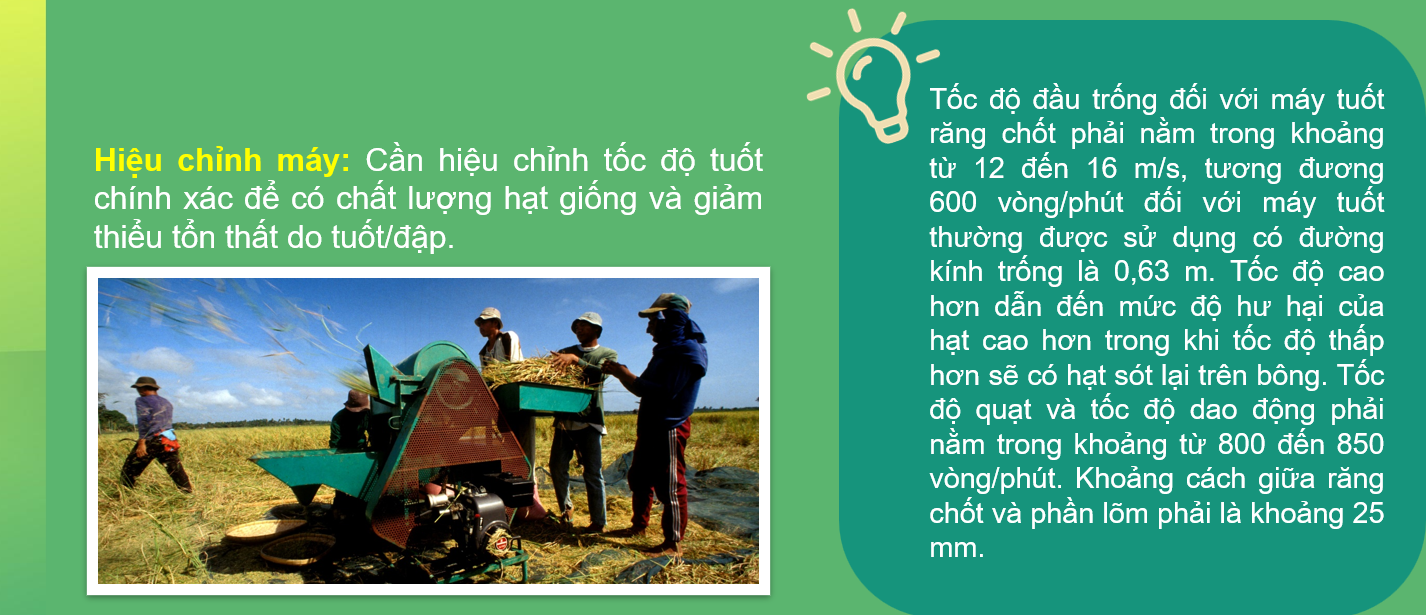 Chất lượng hạt giống càng cao thì việc thu hoạch và đập hạt càng cần được quan tâm nhiều hơn. Việc thu hoạch hạt giống cần có hệ thống và máy móc thu hoạch cụ thể (ví dụ: máy tuốt và máy gặt đập liên hợp).