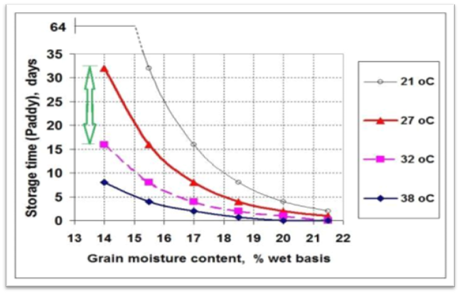 For example, Wimberly (1983) developed a model for paddy storage shown in the figure. At 27°C temperature, the storage time of 14.5% MC paddy is 26 days; while the seed at 16.5% MC can be stored for only 10 days.