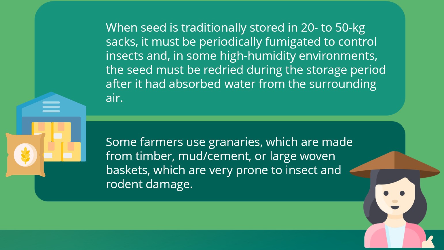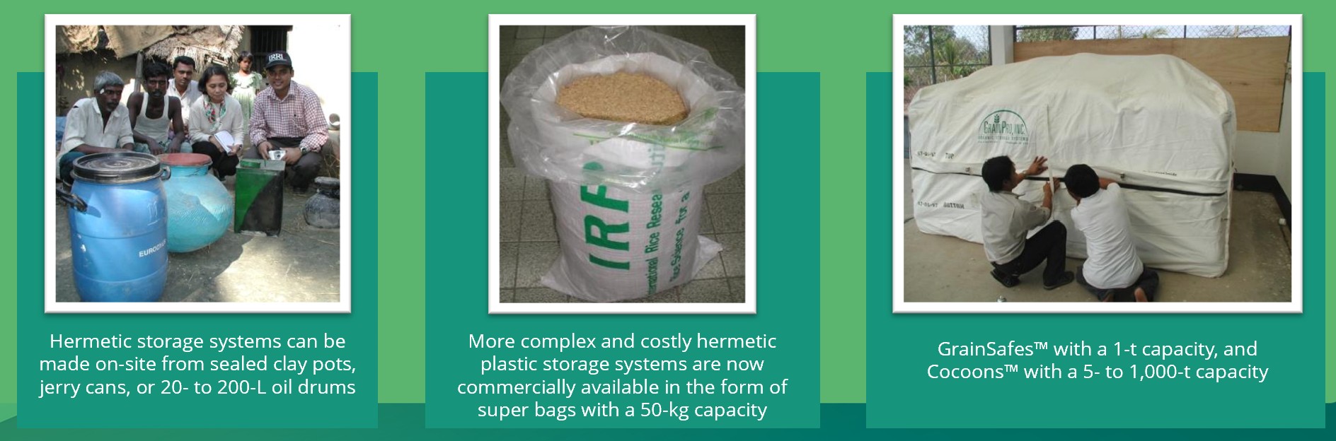 Sealed or hermetic storage is an option that works well in the tropics and in isolated areas. Drying the seed to 12% or less and storing it in hermetic storage reduces the risk of insect and rodent damage and the grain will not absorb moisture from the atmosphere or be damaged by rain. Research has shown that the life of farmers’ seed has doubled with the use of hermetic storage systems.