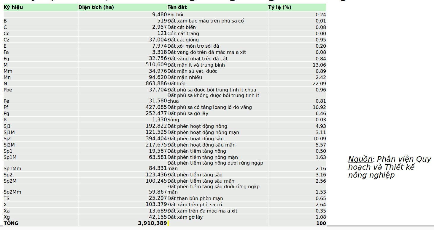 Tỷ lệ các loại đất ở đồng bằng sông Cửu Long