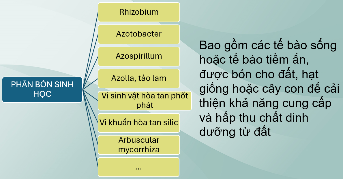 - Các chất có lợi hoặc phân bón sinh học, bao gồm các chất kích thích sinh học thực vật (ví dụ: rhizobium, tảo lam, azolla…)