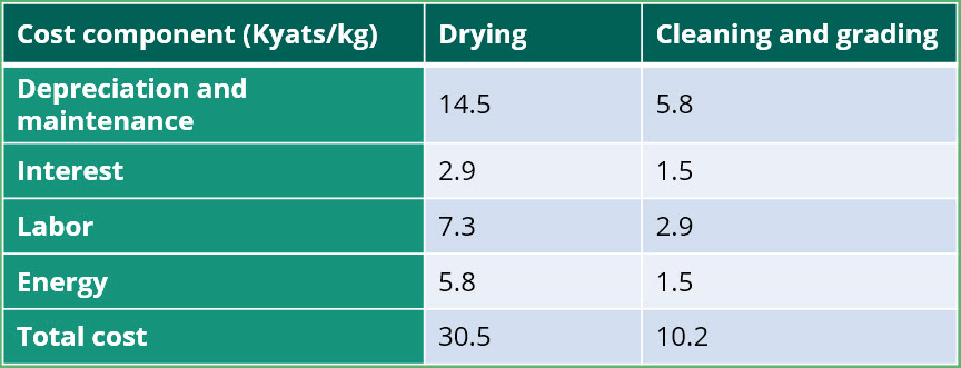 This section is adopted from a case study for a small-scale seed processing business model in Myanmar including seed drying using a flatbed dryer with a capacity of 4 t/batch and cleaning machine able to clean 500 kg/h. The production cost components are shown in the table below.