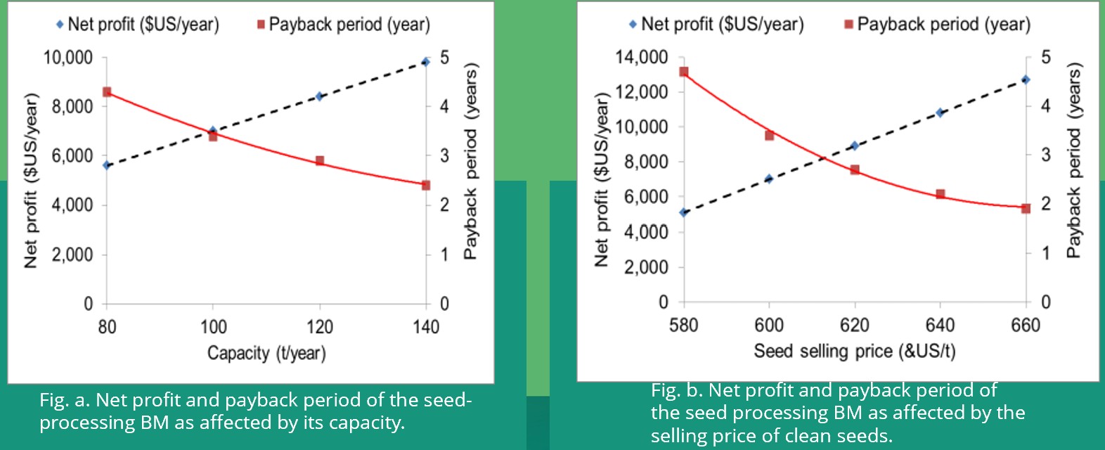 Figures show the sensitivity analysis of net profit and payback period for a seed processing business model (BM) depending on the processing capacity and selling price of the seed, respectively. At the point of 100 t/year (Fig. a), the BM will breakeven at 3.5 years. Assuming an increase of capacity and benefitting additionally from branding reputation starting from the year 3, net profit can reach more than USD12,000/yr (Fig. b).