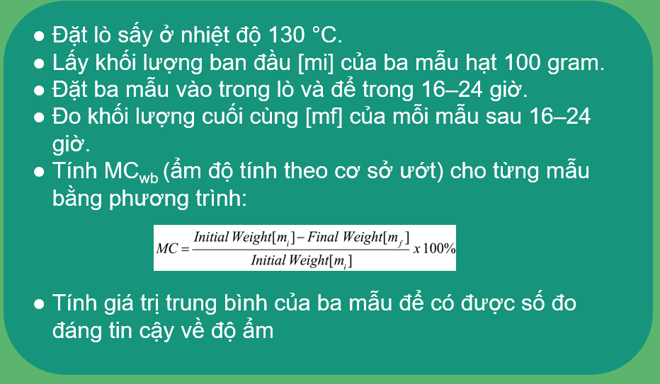Sấy khô bằng lò sấy: Phương pháp sấy khô này mất nhiều thời gian hơn để thực hiện nhưng cung cấp phép đo MC đáng tin cậy nhất. Nó dựa trên việc giảm khối lượng. Mẫu được cân và sau đó đặt vào lò cho đến khi loại bỏ hết nước và cân lại. MC sau đó được tính toán dựa trên mức giảm khối lượng. Vì các phép đo khối lượng có độ chính xác cao nên đây là phương pháp chính xác nhất.