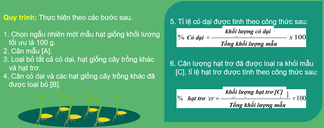 Mẫu hạt giống được thu thập và gửi đi phân tích trong phòng thí nghiệm sau khi sấy khô và xử lý. Các thử nghiệm được tiến hành bao gồm những thử nghiệm đánh giá: