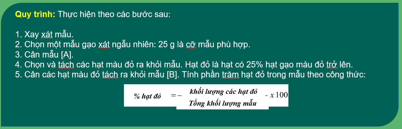 Gạo đỏ: Gạo đỏ không được chấp nhận trên thị trường gạo. Hạt không được có nhiều hơn 25% diện tích bề mặt có màu đỏ hoặc sọc đỏ.