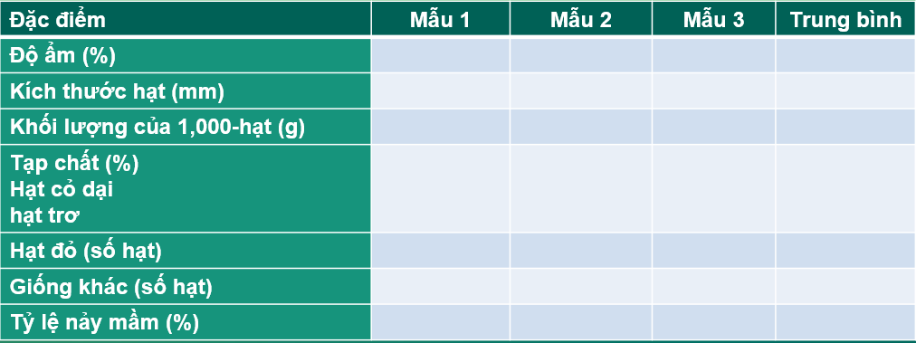 Lấy mẫu hạt giống được cung cấp và tiến hành một loạt các cuộc kiểm tra chất lượng được mô tả ở trên. Sử dụng kết quả thử nghiệm để hoàn thành bảng dưới đây.